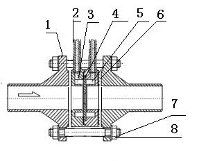 1、法蘭 2、導壓管 3、前環(huán)室 4、節(jié)流件 5、后環(huán)室 6、密封墊片 7、螺栓 8、螺母